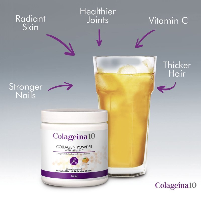 Colageina 10 is an expert brand with 10 years on the beauty market. Collagen is a natural protein found in the human body which is essential for healthy skin, hair, nails and joints. As we age, collagen production declines, resulting in weak hair and nails, loose, sagging skin and deep wrinkles. Supplementing your diet with hydrolyzed Colageína 10 is the best way to ensure a healthy and firm body, also improving the effects of aging while keeping your skin youthful, hair and nails healthier and stronger.