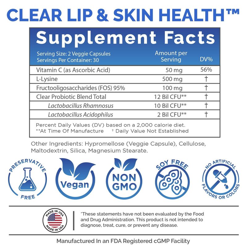 - HELP FOR RECURRING COLD SORES - Clear Lip and Skin Health is a specially formulated probiotic blend with key ingredients like lysine and vitamin C that helps to prevent the overproduction of arginine in the body. Arginine is known as a common trigger for lip and mouth blisters, as well as other issues.