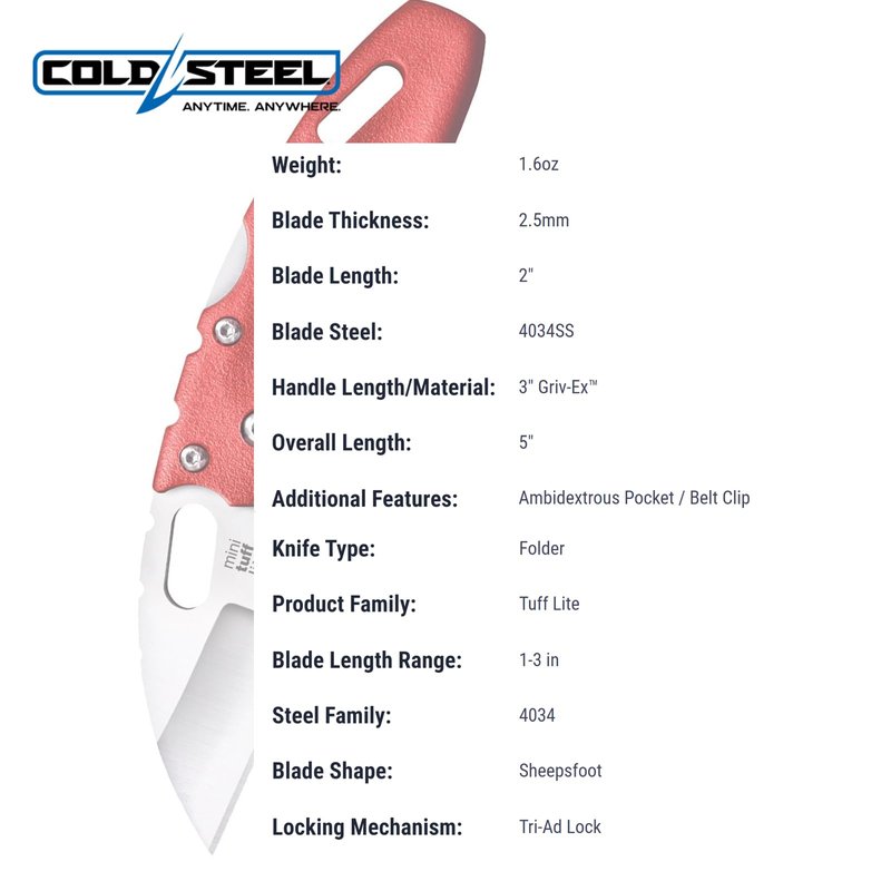 - TRI-AD LOCK - Equipped with Cold Steel's renowned Tri-Ad locking mechanism, the Mini Tuff Lite folding knife offers unparalleled strength and shock resistance; This locking mechanism enhances the knife's reliability and safety during heavy-duty tasks