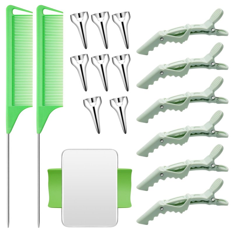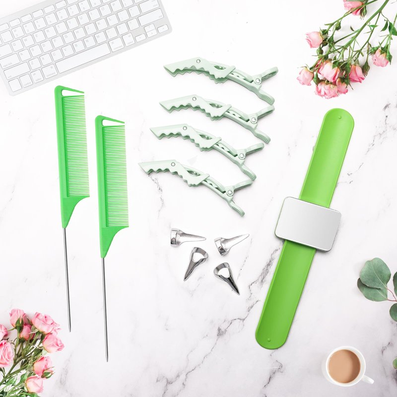 Coldairsoap 17 Piece Hair Styling Tool Set: 8 Sectioning Rings, 2 Rat Tail Combs, 6 Clips, and Magnetic Wrist Pin Holder for Braiding (Green)