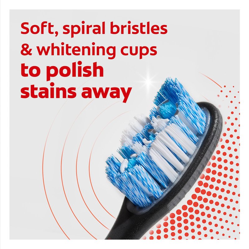 - Spiral bristles and whitening cups to polish stains away for a bright smile