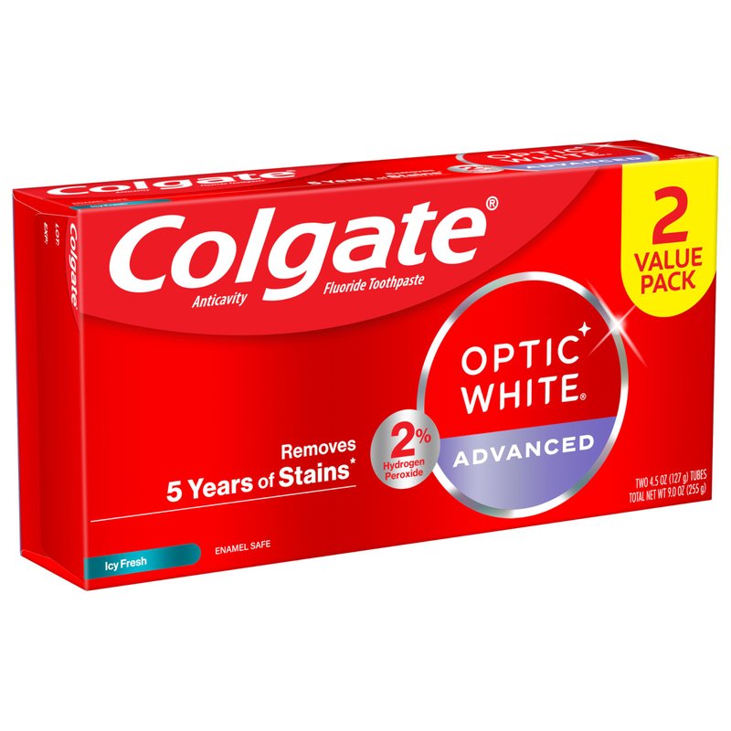 - Includes two (2) 4.5 oz tubes of Colgate Optic White Advanced Icy Fresh Hydrogen Peroxide Toothpaste, Teeth Whitening Toothpaste
