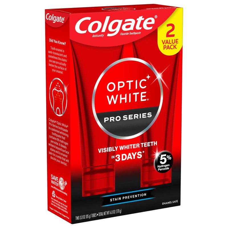 - Includes two (2) 3.0 oz tubes of Colgate Optic White Pro Series Stain Prevention Hydrogen Peroxide Toothpaste