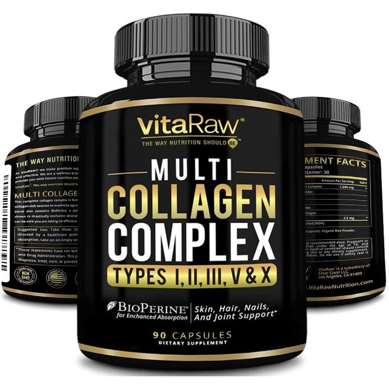 THE FOUNTAIN OF YOUTH HAS BEEN FOUND, FEEL & LOOK YOUR BEST, WE HAVE CREATED THE ULTIMATE MULTI COLLAGEN CAPSULES: this was done to ensure that you get all the benefits that collagen hydrolysate has to offer; collagen is found in hair, skin, nails, joints and muscles, it's the body’s most abundant protein; as time goes on, collagen protein depletes, causing aches and pains, thinning hair, brittle nails, & sagging skin; Rejuvenate your body & help slow down the aging process from the inside out REJUVENATE AND RESTORE: Our premium super collagen pills help to increase skin elasticity, promote soft glowing skin, while reducing lines & wrinkles; Feel your nails and hair grow thicker, stronger, and longer; Aside from the beauty benefits, our scientifically designed collagen works to restore vital proteins your body needs to support bone strength, joint support, mobility, flexibility, metabolism, digestion, immune health, and more WITH VITARAW'S PREMIUM GRADE BLEND, OF 100 PERCENT HYDROLYZED COLLAGEN PEPTIDES: created with all 5 types of collagen I, II, III, V, V bovine collagen, bovine bone broth, marine collagen, chicken bone broth, and egg shell membrane, all of your collagen needs are covered; Don't cut yourself short, and dont settle for a single source of collagen when you can have all 5 types packed in easy to take collagen pills for women and men DON'T SETTLE FOR LESS THAN THE BEST, YOU CAN’T BENEFIT FROM COLLAGEN WITHOUT IT BEING ABSORBED: With that being said, we have added a patented ingredient, Bioperine, for its ability to increase the absorption of nutritional compounds; It allows for this collagen supplement to have its desired effect; lastly, when taking collagen, a sufficient dose is key for optimal results with 1800 mg of properly balanced collagen per serving, we ensure you are taking a powerful dose A BRAND YOU CAN TRUST: our hydrolyzed collagen also called colageno hydrolizado is scientifically