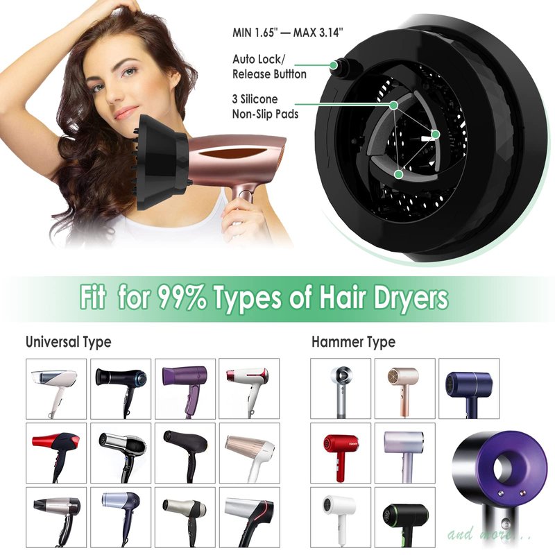 - COLLAPSIBLE UNIVERSAL HAIR DIFFUSER: Whether it’s the general hair dryer or special hair dryer, even for Dyson, the diffuser can adjust in size to fit most of different brand blow dryers on the market. Compared to general hair diffusers, which are bulky and inconvenient to carry, it has a collapsible design as well which makes it a great blowdryer diffuser to take with you while traveling. Just take out the opening and turn it counterclockwise to secure blower, then start your curly journey.