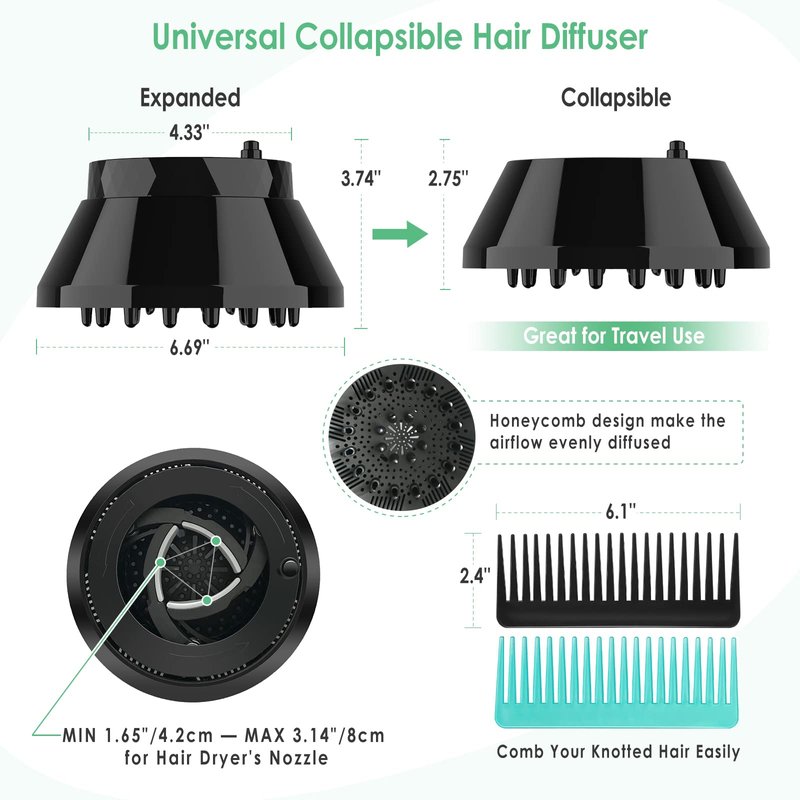 Collapsible Hair Diffuser for Curly Hair, Universal Hair Diffuser Attachment for Hair Dryer Adjustable from 1.65 inch to 3.14 inch, Blow Hair Dryer Diffuser for Long Thick Natural Wavy Hair