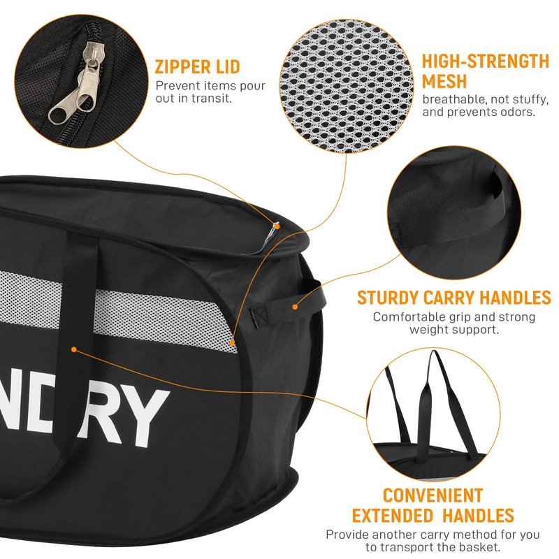 This strong mesh pop up laundry hamper with zipper lid is made with tear-proof fabric, sturdy, breathable, collapsible, and prevents odors.