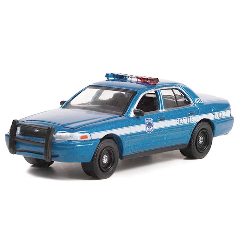 Brand new 1/64 scale diecast car model of 2001 Crown Victoria Police Interceptor Blue Metallic "Seattle Police, Seattle Washington" "Hot Pursuit" Series 44 die cast model car by Greenlight 43020D