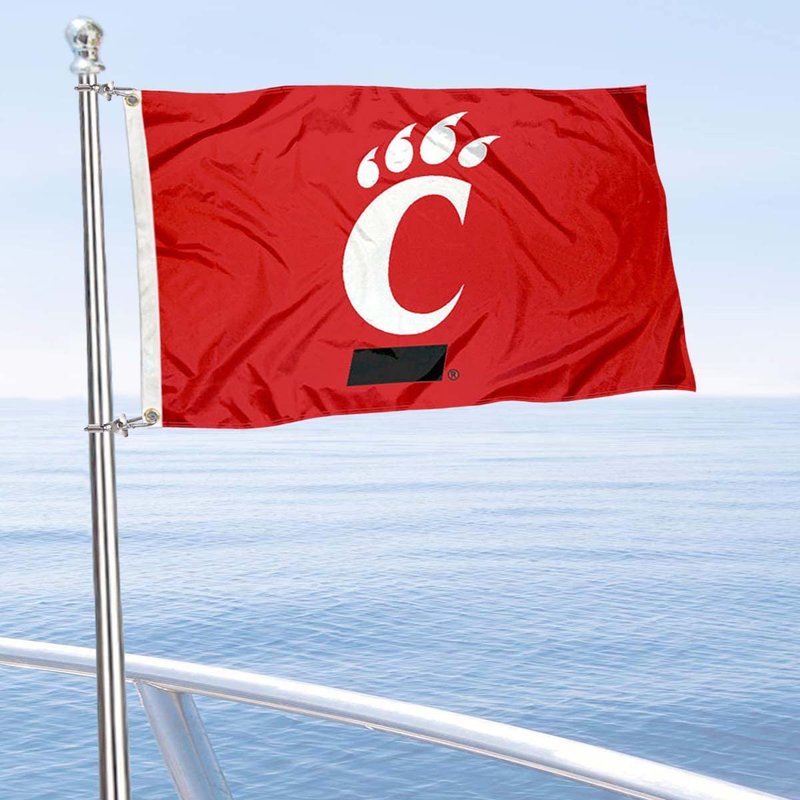 Our University Cincinnati Golf Cart and Boat Flag measures 12x18 inches in size, has quadruple-stitched fly ends, is made of durable 2-ply double-sided polyester, and has two metal grommets for attaching to your boat mount, golf cart, motorcycle mount, or any of your uses. The screen printed Cincinnati Bearcats logos are Officially Licensed and Approved by University Cincinnati and are viewable and readable correctly on both sides.