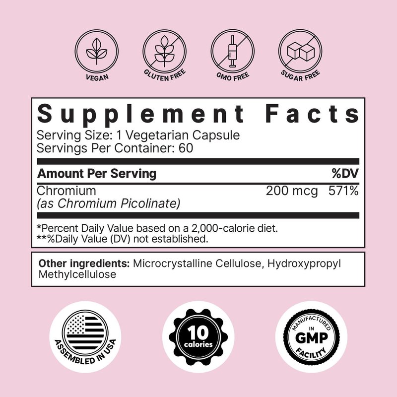 - PURE CAPSULES NO NAUGHTY ADDITIVES - Stay pure with our vegan, keto friendly, gluten free, GMO-free, 0 calorie chromium supplement. Each bottle of chromium minerals contain ZERO artificial sweeteners or colorants.