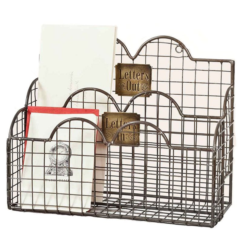 - Features two brass plaques that read "Letters in" and "Letters Out"