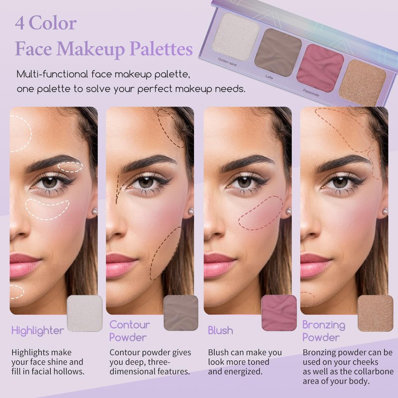 - 【Classic Facial Makeup Palette】: Our 4-in-1 face makeup palette included highlighter, blush, bronzing powder and contour in one, catering to all your facial makeup needs.