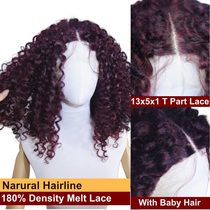 Hair Length: 20 inch Hair Weight: 450g Hair Color: 99j Burgundy Mixed Black Texture: Classic Curly Hair Material: Soft Similar Human Hair Fiber, Heat Resistant Wig Density: 180% Wig Lace: 13x5x1 Lace wig