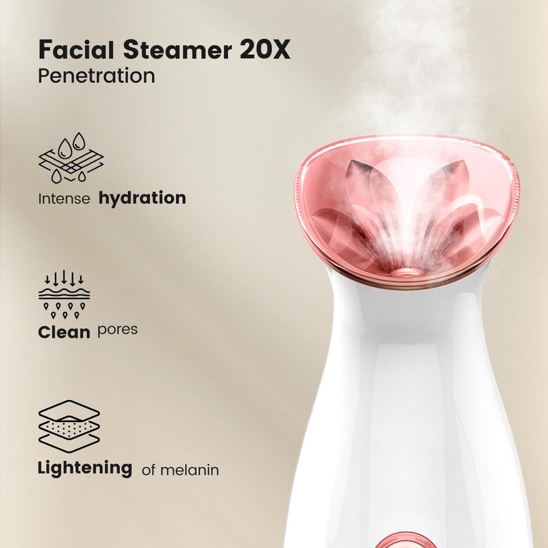 - 20X Penetration --- It only takes 10 seconds to produce ultra-fine nano-sized steam particles. It is 20x more effective in penetrating the skin. Deeply moisturize, make your face rosy and delicate