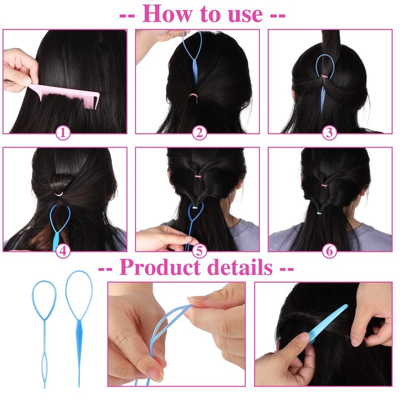 SpecificationsSize:Topsy Tail Hair Tools: 0.98*5.52 inches/1.57*7.16 inches longRat Tail Comb: 9.1 inches/Double Sided Edge Brush: 6.9 inches/Teasing Brush: 8.8 inchesFeatures:1. Elastic hair bands and styling tools are perfect for little girls and women to create cute hairstyles.2. The rubber band is soft and elastic, and the hairbrush has thick bristles, which can be combined with the upside-down tail hair tool and bobby pins to create different hairstyles.
