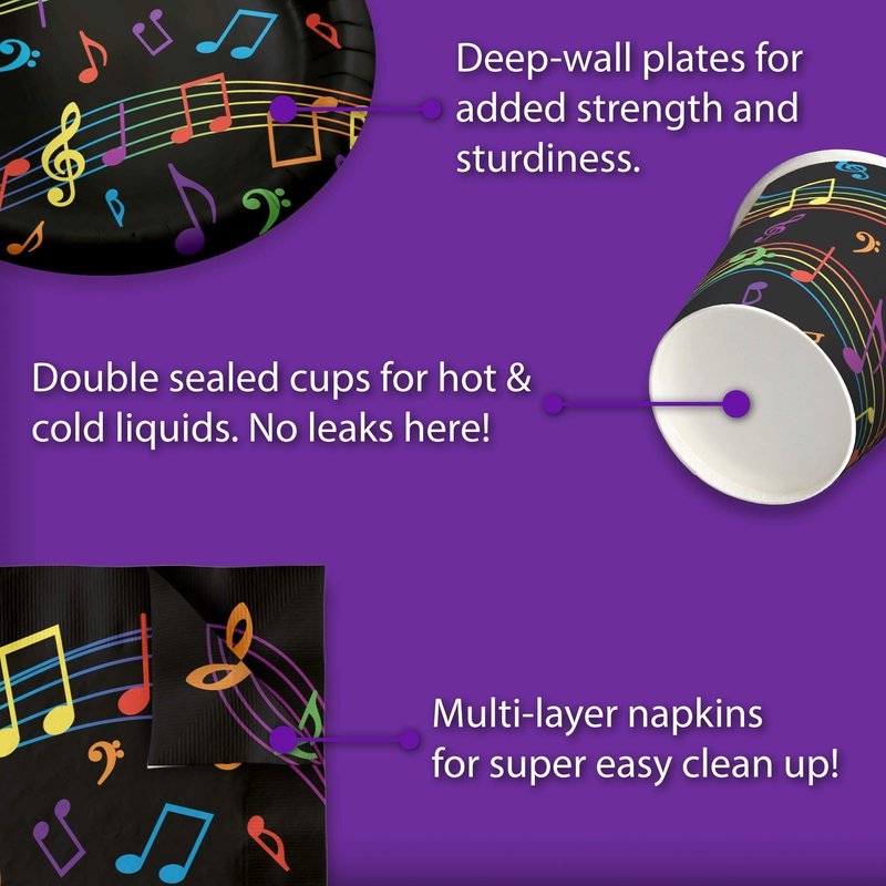- PREMIUM DESIGN - Our Colorful Music Theme Party Supplies are suitable for girls and boys birthday parties, birthday celebrations with your family and friends, baby showers or for just fun-filled daily meals, snacks, and desserts with picnics and cookouts. Shrieks of joy will be your reward when you use these fun and unique party supplies.