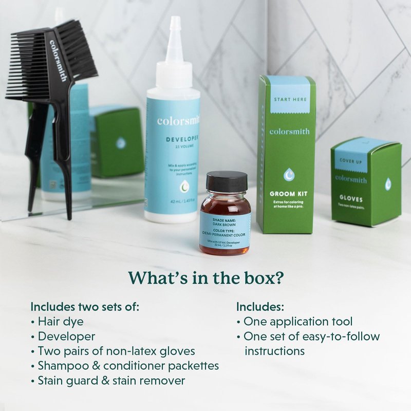 - WHAT’S IN THE BOX. Includes two sets of demi-permanent hair color, developer, easy-to-follow instructions, two pairs of non-latex gloves, one application tool, shampoo & conditioner packettes, stain guard & stain remover
