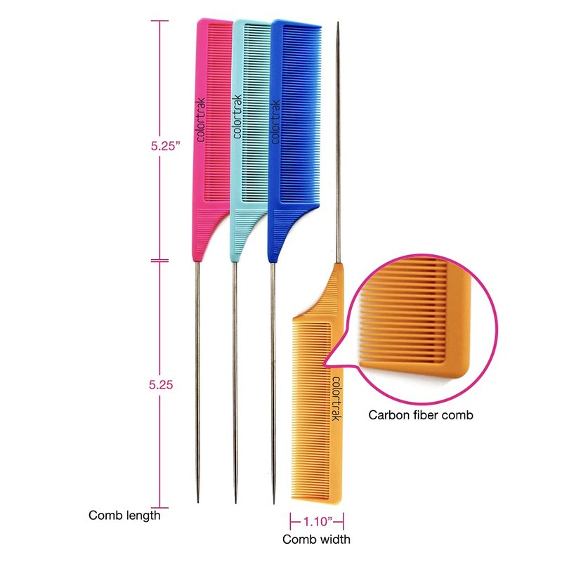 Colortrak Carbon Fiber Combs, Durable, Heat-Proof Comb, Anti-Static to Prevent Frizz, Bleach Safe Stainless Steel Pintail, 4pc Bag (Orange, Teal, Blue, Pink)
