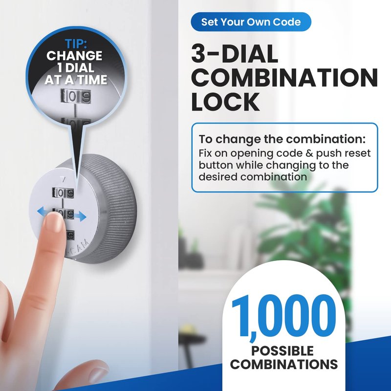 - KEYLESS SECURITY LOCKS - Security doesn't have to included managing keys or replacing locks. The Combi-Cam solid metal combination cam lock is 100% keyless, secure and long-lasting. With 1,000 possible combinations, this lock is perfect for keeping your belongings safe. Combi-Cam 3-dial cabinet lock hardware comes with a 3/4" straight cam, 1-1/2" straight cam, 90 degree stop cam, 1-1/2" offset cam, and 3/4" wood prong washer.