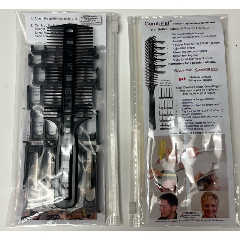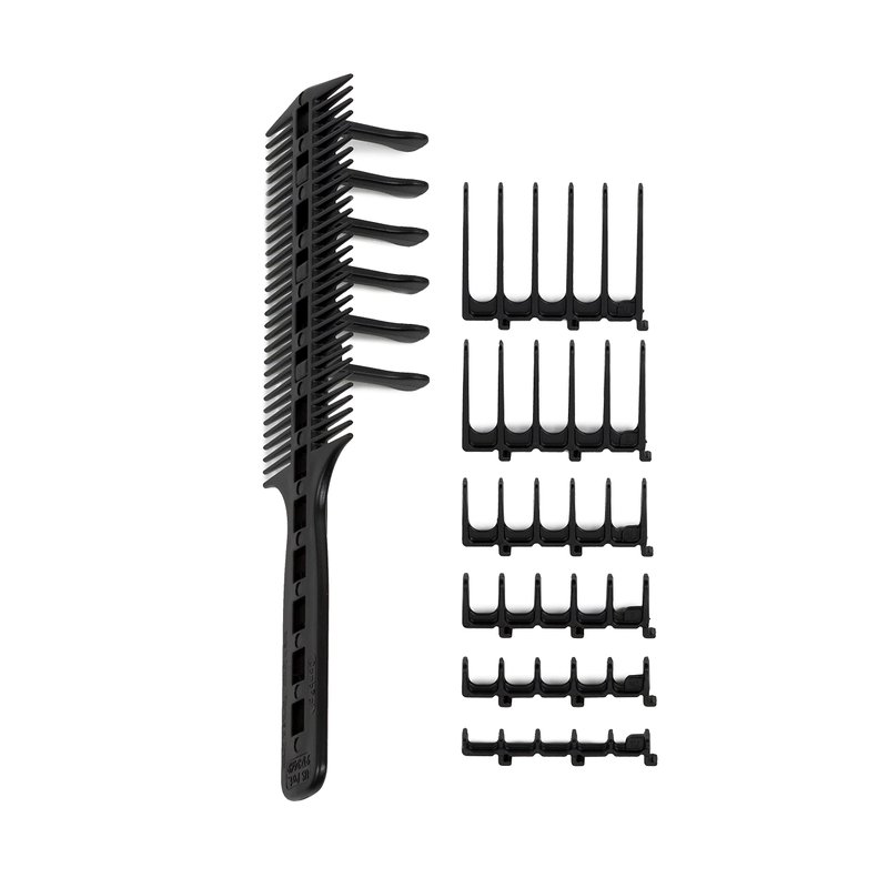 CombPal haircutting tool with 1 double-sided comb and 7 guides from 1/2" to 2 1/2" (1.2 cm to 6.4 cm).