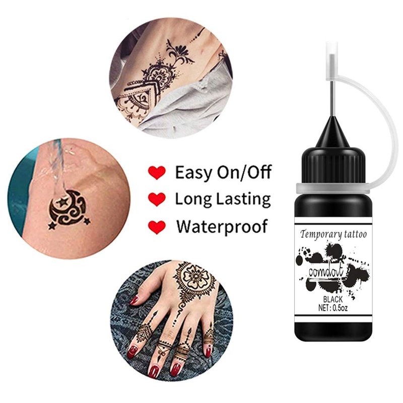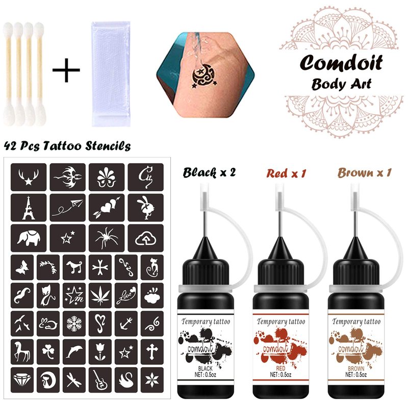 - Full Package: 4 Bottles temporary tattoo ink (black/brown/red), which contains all the tattoo accessories. capacity about 15ml, 1 bottled can make about 35 small tattoos designs.