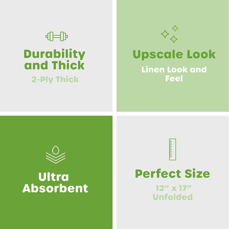 Make your life and the life of your guests and friends a little more elegant and smooth with Comfy Package's 6-fold Linen-Feel Disposable Paper Guest Towels. In the bathroom for drying hands and face, on the table for impressing party and wedding guests, in the kitchen for wiping tables and counters these airlaid napkins can do it all. They’re also free from the inks, dyes, and fragrances that some paper napkin brands use. Are they fancy? Oh, you bet. But fancy isn't everything. A 200 value pack of cloth like hand towels provides the freedom of using a clean fresh towel every time and helps reduce the spread of germs. As white ultra-absorbent, soft, smooth and durable your family and guests will thank you. Generously sized at 12” x 17 unfolded, and 8.5” x 4” folded. These are the perfect premium paper napkins for taking care of life’s little messes, so definitely give them a try.