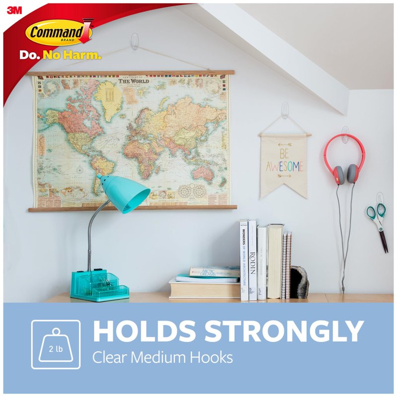 - STRONG AND VERSATILE- Command Clear Hooks hold strongly on a variety of smooth indoor surfaces including painted walls, smooth ceilings, finished wood, glass, tile, and metal. Not recommended to place on or near windows