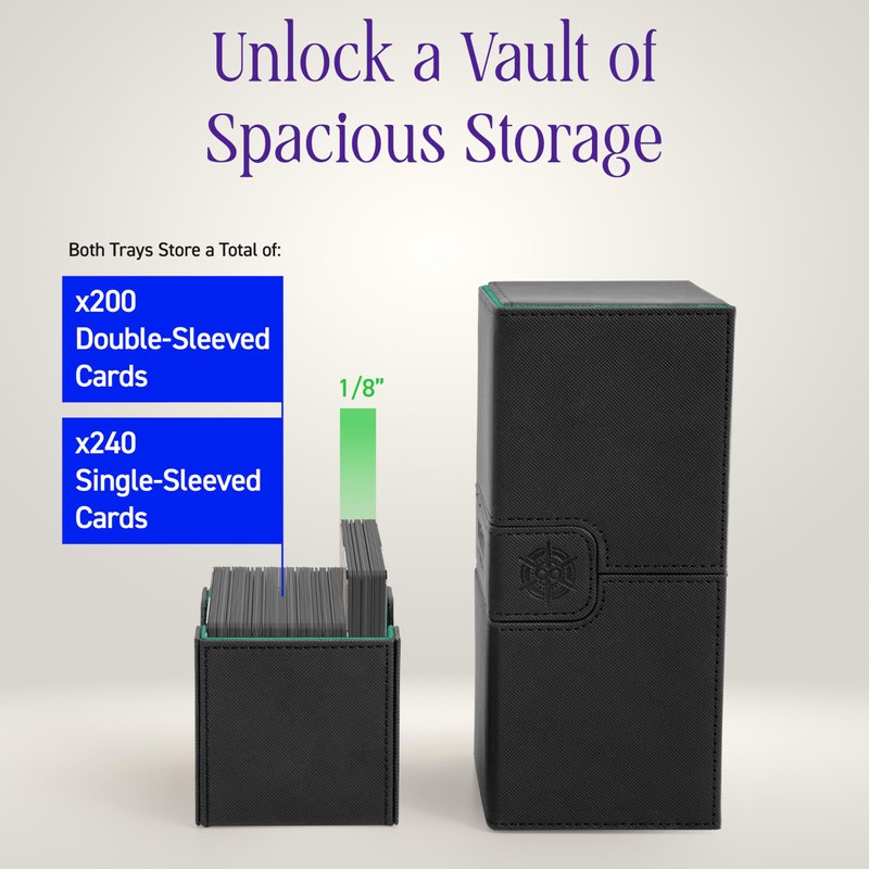- STREAMLINED STORAGE SOLUTION: Up your game with the Infinity Vault Sideloader 200, a card storage box equipped with streamlined sideloading trays for easy access, faster setups, and quickdraws; With larger trays for convenient play, our sidewinder deck box outshines others with an extra ⅛ inch per tray to seamlessly store two double-sleeved decks.