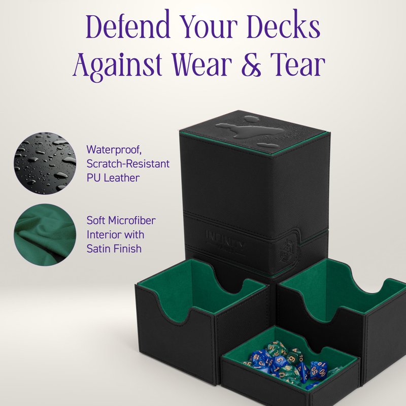 Welcome to the next level of gaming excellence with the Infinity Vault Sideloader 200, your ultimate ally in the quest for gaming greatness. This isn't just any card storage holder; it's a marvel of design that holds up to 200 double-sleeved and 240 single-sleeved cards. Plus, it’s commander deck-friendly! With an extra 1/8" to perfectly cradle your double-sleeved decks, our storage box ensures your prep time is slashed so you can focus on strategy and play. Built tough with water-resistant and scratch-resistant PU leather and lined with a satin-finished microfiber interior, this deck box with dice tray defends your gear against wear and tear without compromising on style. It also includes a dedicated dice compartment that ensures your dice are always at the ready, without the risk of denting your cards. Featuring powerful magnets and triple snap-and-shut covers, our deck case keeps your cards locked down even when dropped or shaken. Lightweight yet resilient, this portable deck box is your go-to for both local skirmishes and epic tournament journeys. Available in five legendary colors to match your style, our commander deck boxes are perfect for card collectors or gamers who demand the best in both protection and flair. It’s not just a double deck box but an impressive centerpiece that proves to your opponents you’re serious about your game. Level up with the Infinity Vault Dual Deck Box today to store, protect, and showcase your collection with confidence.
