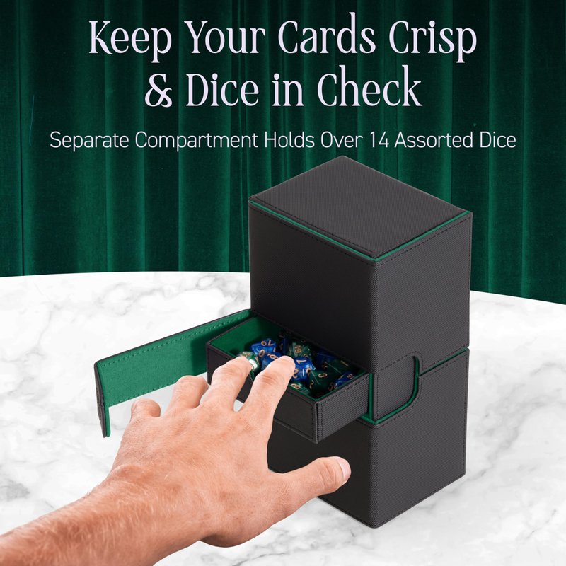 - DEFEND YOUR DECK AGAINST DAMAGE: Our magic deck box is crafted from invincible water-resistant and scratch-resistant PU leather complemented by a microfiber interior with a sleek satin finish, so you can protect your collection in style; It also features a separate dice vault that secures over 14 dice to safeguard your cards from pressure and damage.
