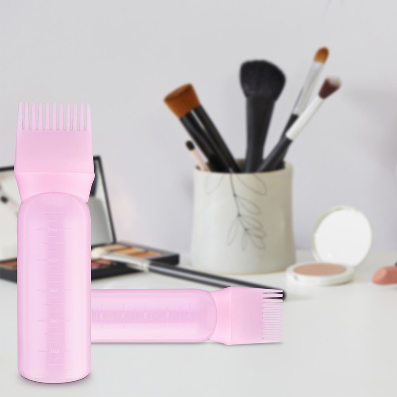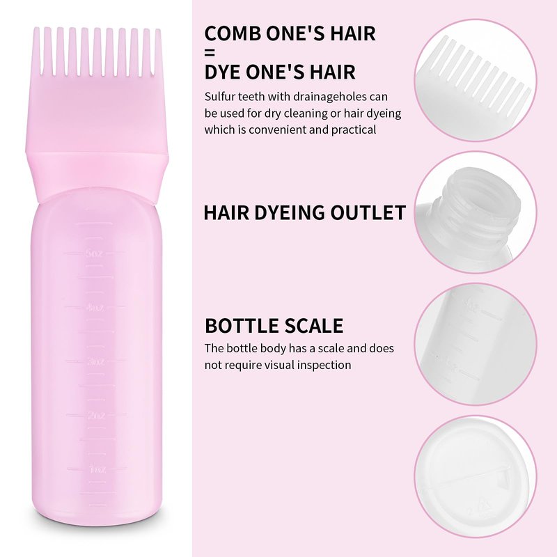 COMNICO Root Comb Applicator Bottle, 6 Ounce Plastic Squeeze Hair Dye Oil Applying Applicator Brush Cap with Graduated Scale, Portable Hair Color Dispenser (Pink)