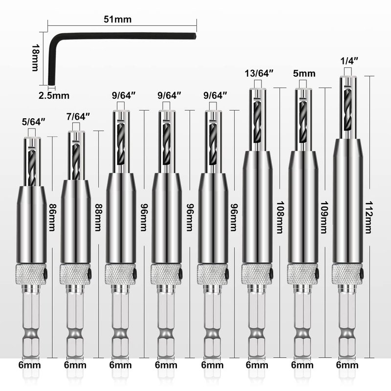- All Size You Need: Hinge drills come in 8 different sizes: 5/64', 7/64'', 9/64'', 9/64’’, 11/64'', 13/64'', 5mm, 1/4", with a hex key to meet your needs.