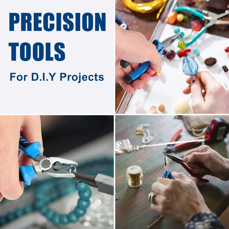 - 【EASY TO USE】 The mini pliers features bi-material TPR handle that offers a comfortable grip while using. This soft rubber handle can prevent fatigue even for long-time work. And the anti-slip design allows for precise control of the pliers tool set.