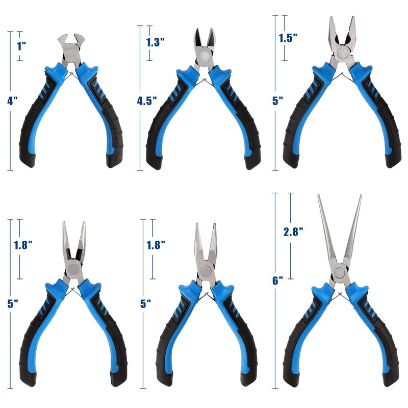 - 【MULTIPLE PLIERS】 This mini pliers set includes 6-inch mini needle nose pliers, 5-inch linesman pliers, 5-inch mini long nose pliers, 5-inch mini bent nose pliers, 4.5-inch diagonal pliers and 4-inch end cutting pliers. The 6 piece pliers tool set helps to fix electronic tools and is suitable for crafts making.