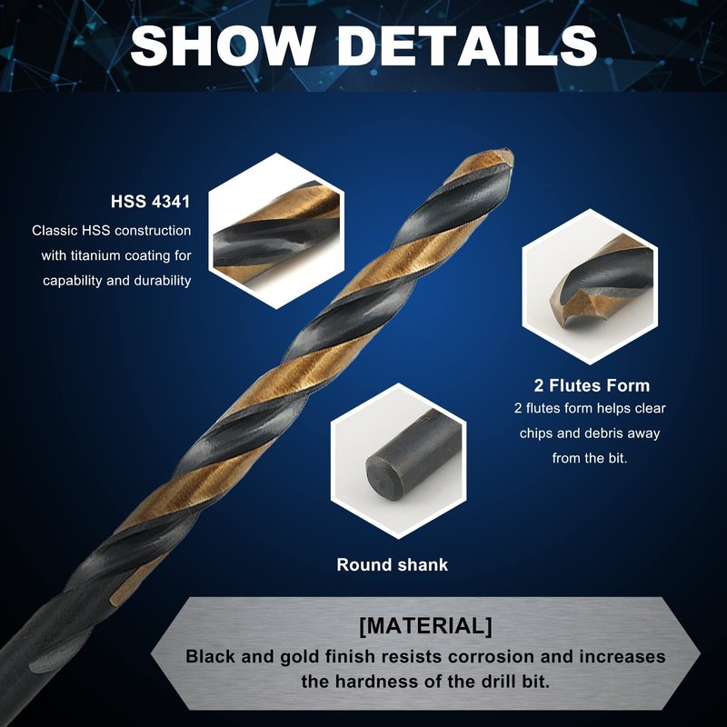 - High Quality Material - Versatile general-purpose drill bit set, High Speed Steel, black and gold finish resists corrosion and increases the hardness of the drill bit.
