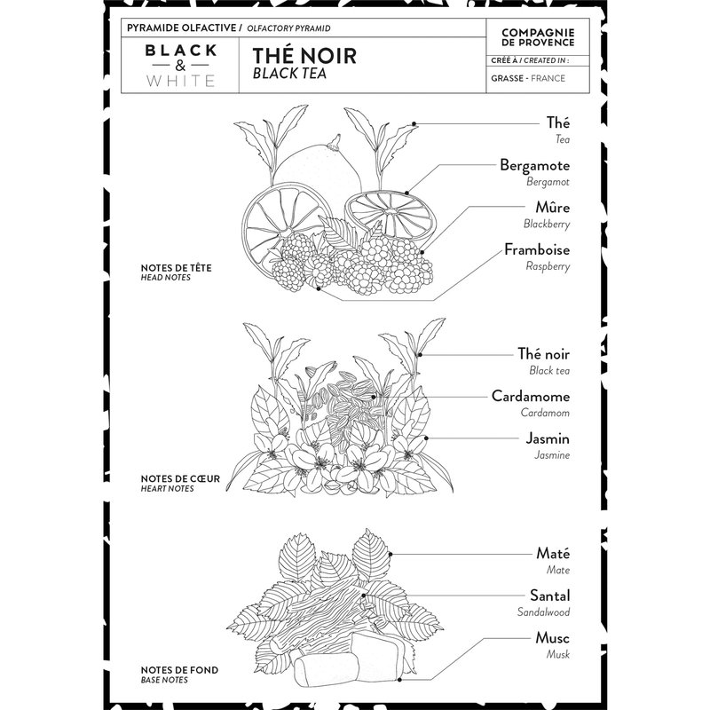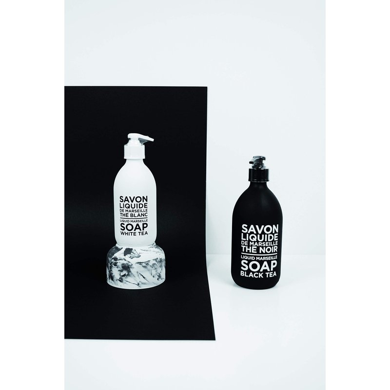 Made in a cauldron according to tradition, as does its ancestor, the authentic cube from Marseille, this liquid soap is elaborated with vegetable oils.Naturally glycerined, it gently cleanses the skin.Presented in a lacquered glass bottle with a timeless and contemporary design which uses the strength of contrast to create an inspiring graphic universe. Fragrance: A gentle fragrance created in Grasse, with notes of black tea and blackberry. Use Advice: Suitable for frequent skin wash. Can be used for body wash. Apply on damp skin, gently rub and rinse thoroughly. Composition: Natural foaming coconut oil.No colorants, no animal fats.