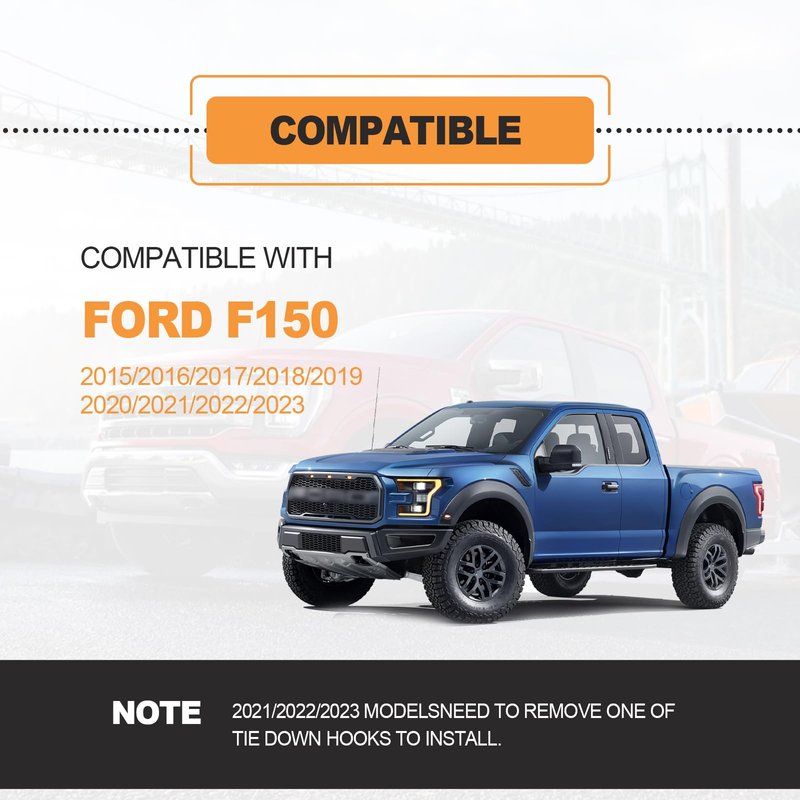 - 【WIDE COMPATIBILITY】Great gift for F150 truck owners. Compatible with 2015/2016/2017/2018/2019/2020/2021/2022/2023 F150 models. NOTE: 2021/2022/2023 models NEED TO REMOVE ONE OF TIE DOWN HOOKS TO INSTALL.