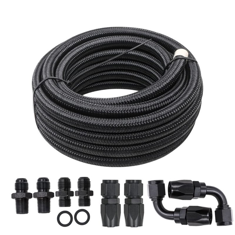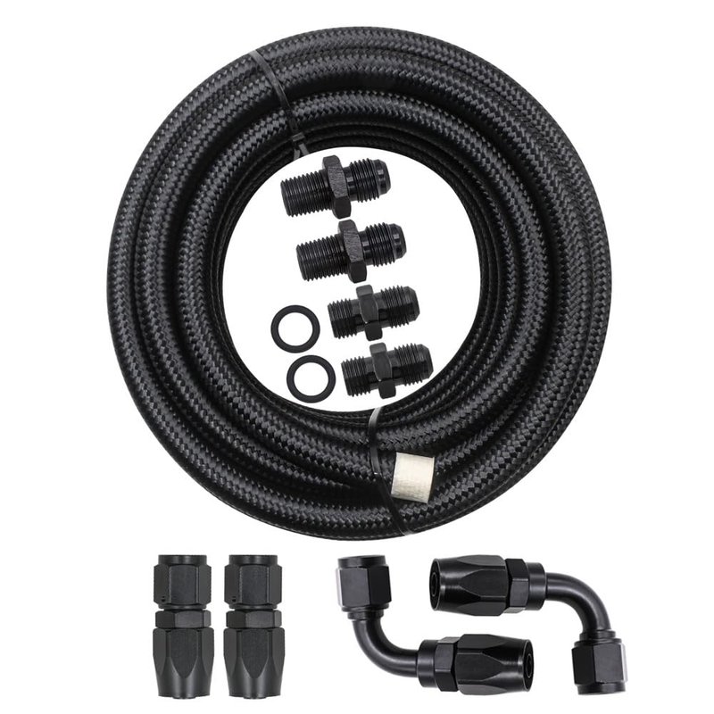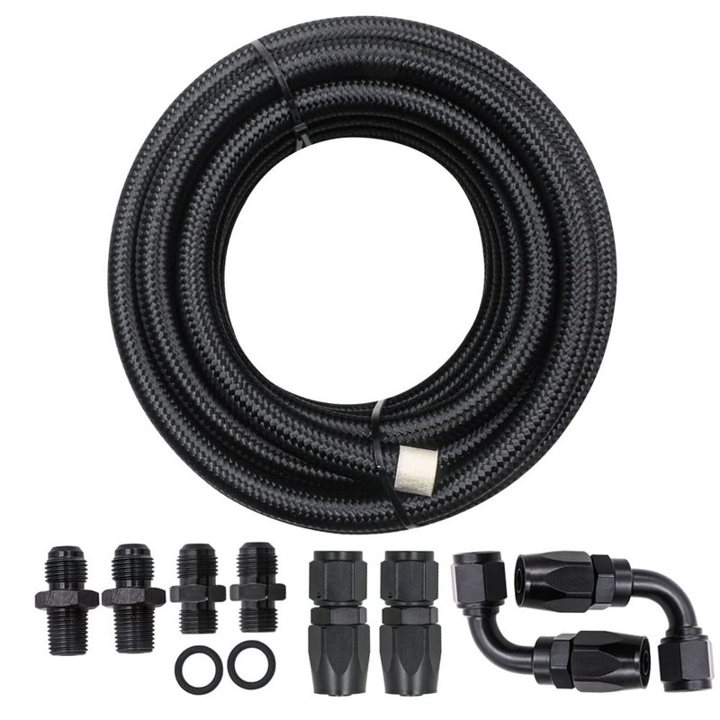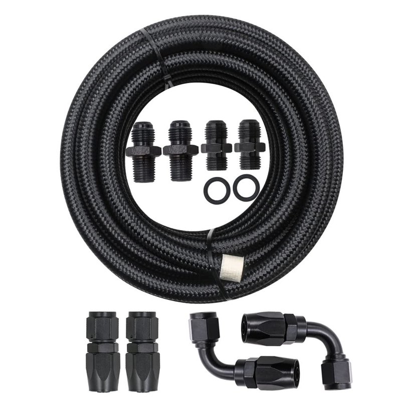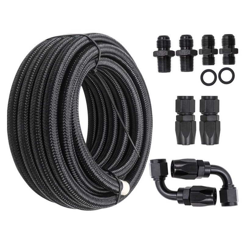 - Package included: 1x 15' FOOT OF PREMIUM -6 STEEL BLK BRAIDED HOSE , 2x 6 AN STRAIGHT HOSE ENDS BLACK, 2x 6 AN 90 degree HOSE E,NDS BLACK, 2x BLACK 1/4"NPSM X -6 TRANSMISSION FITTINGS, 2x BLACK 1/4"NPT x -6 RADIATOR FITTINGS, 2x Separator Clamp as picture show
