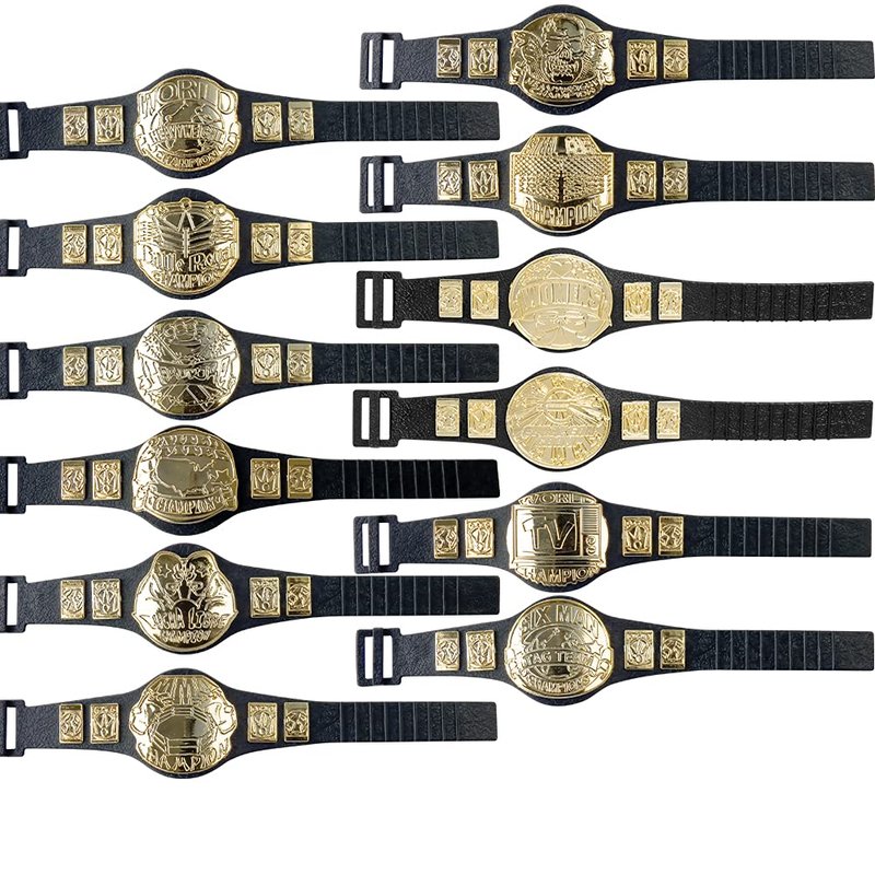 Complete set of 12 different championship belts for wrestling action figures. fits nearly any wrestling figure from 1984 to the present. Each belt has a black flexible strap with Plastic gold medallions, measures 5.75 inches long. Great starter kit for a wrestling figure collection!