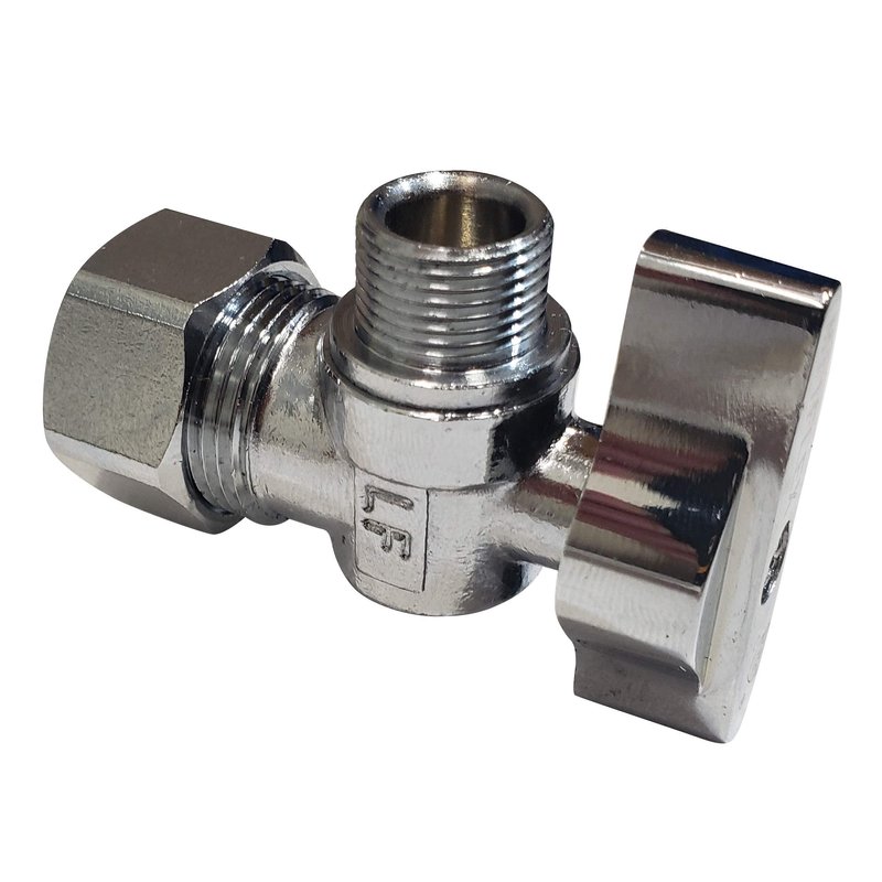 QTY 1: 1/2" NOM copper pipe inlet, 3/8" COMP outlet chrome plated single-piece body 1/4 turn angle shut off valve
