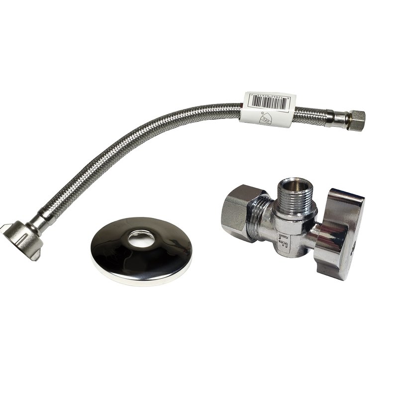 This set includes a heavy duty, single piece body 1/4 turn angle stop valve providing a solution to long lasting, dependable shut-off valve you need to put in for your residence, commercial properties, and all places that require an angle shut-off valve with 1/2 in. NOM. inlet x 3/8 in. COMP outlet. The set also includes a chrome plated beveled 1/2 in. NOM escutcheon plate and 12" stainless steel braided toilet water supply, with zinc-plated brass nut for heavy duty usage, to hook up your toilet. The valve is chrome plated, lead free, solid single piece design made for long-lasting durability and heavy duty usage. Every valve is leak-free quality controlled by the factory during the manufacturing process. The set is made for homeowners, DIYers, plumbers, and contractors to be used in potable and non-potable plumbing and water distribution systems.
