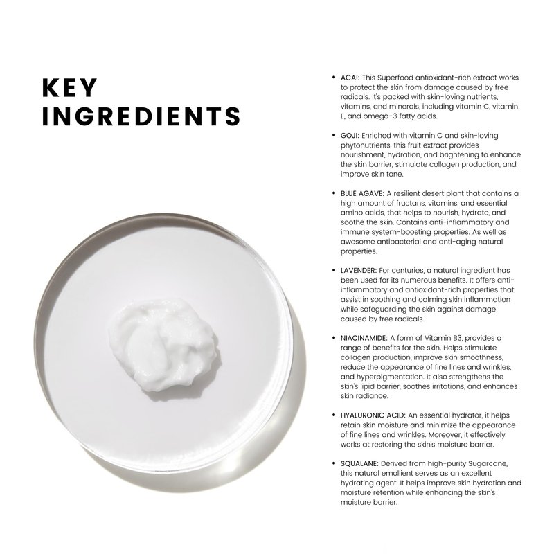 - Nourishes and revitalizes: A blend of antioxidants, vitamins, and minerals, including superfruit extracts, provides the skin with essential nutrients to nourish, revitalize, and combat signs of aging.