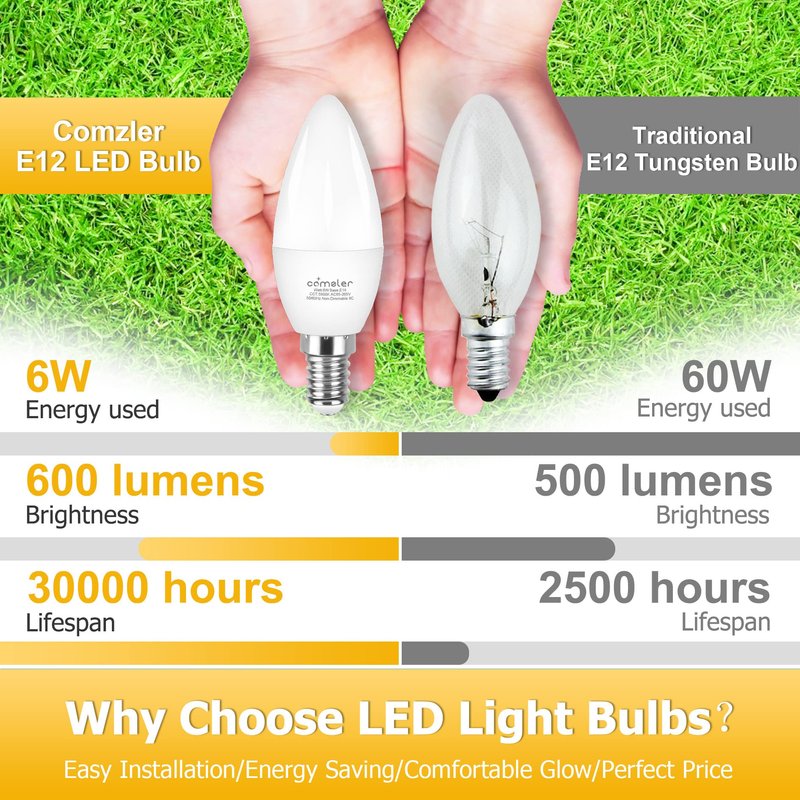 - Protection Eyes: Candelabra LED Bulbs,Meet Strict Test Criteria Including Flicker, Strobe, Glare And Color Rendition, Which Would Protect Your Eyes.With Comzler LED Bulbs, Light Is Always 80+ Cri For Better Color Rendition, Making Greens, Reds, And Blues In Your Home Appear More Accurately.Provides 600 Lumen, Gives You A High Brightness.