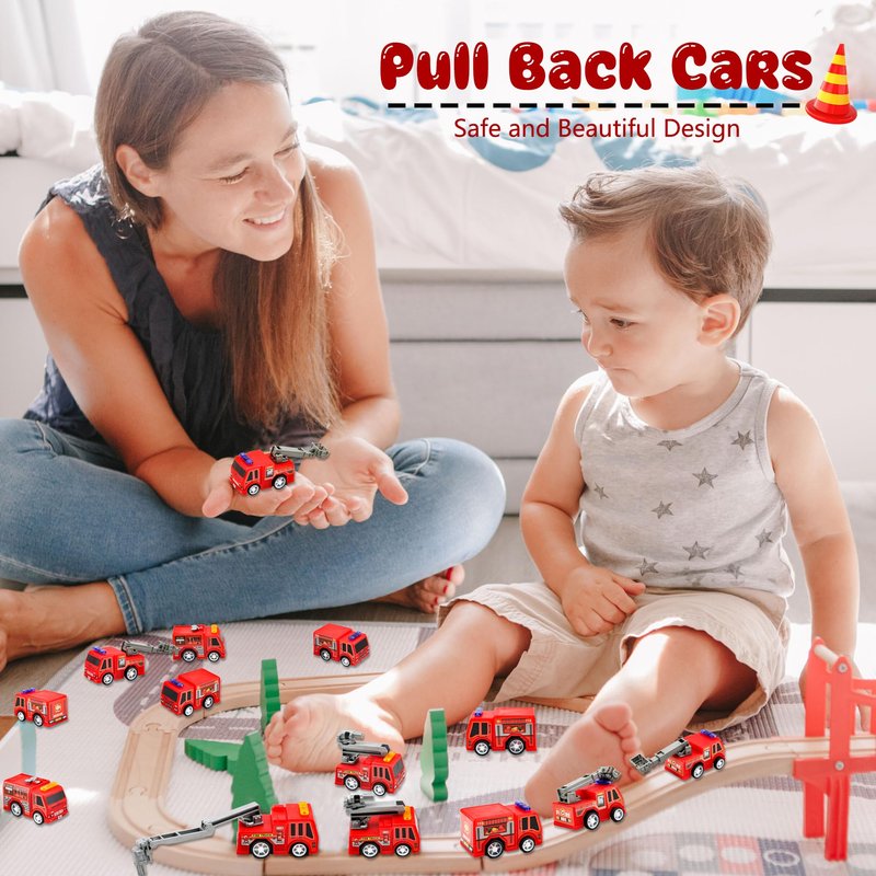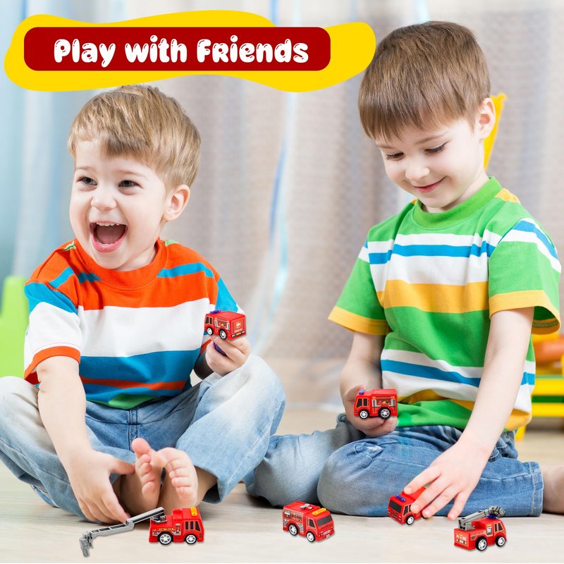 - 【No Battery Design】: Small firetruck and fireman toy set adopts a pullback mechanism, which can move quickly with a simple pull, no battery or charging required, convenient to use. These mini fire engine trucks are fitted with a classic pullback mechanism. Pull them back, let go, and watch them cruise across the floor.