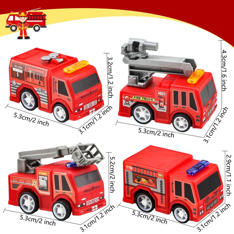 - 【Size Details】: Mini pullback fire truck size is about 2.1 x 1.2 inch ( L x W ), and the height is about 1.1-2 inch. The pullback fire truck toys size is small and light, easy to hold, play and carry without taking up too much space.