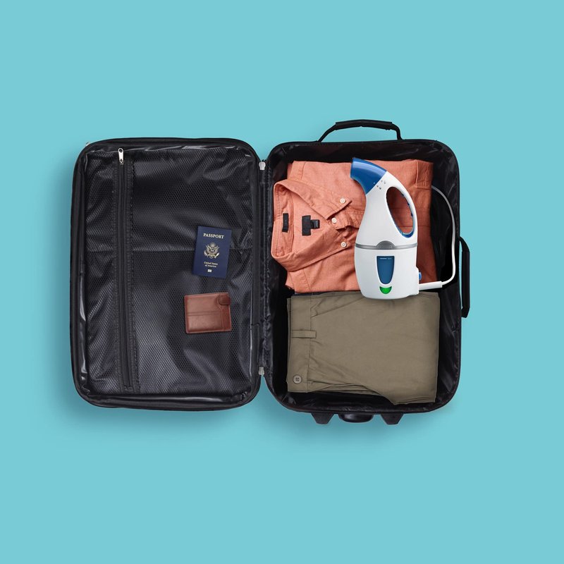 - Compact Design: This steamer is ideal for travel and on the go touchups, heating up fast and dewrinkling fabrics in minutes. Features an ergonomic handle, spill protection feature, and measures only 9 x 5.5 inches with a large, removable steam head