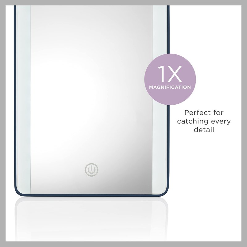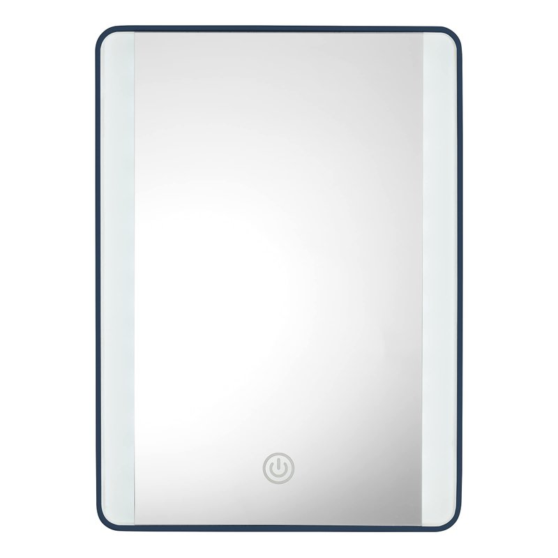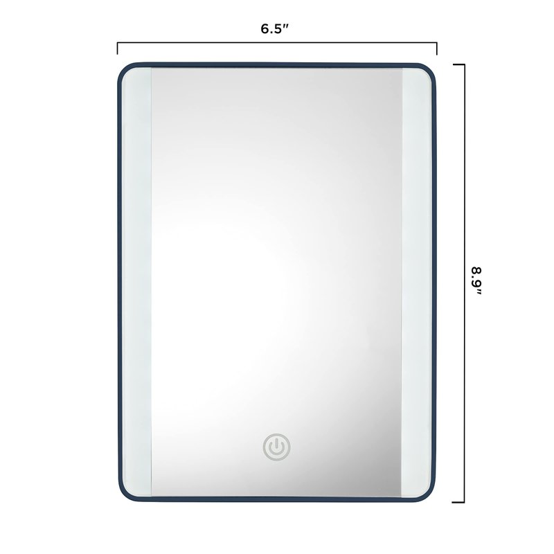 - Stylish Surroundings: This 8.9" x 6.5" rectangular mirror features a glossy navy finish that compliments any decor. The touch-screen On/Off button located on the face of the mirror features 3 light settings: low, medium, and high.