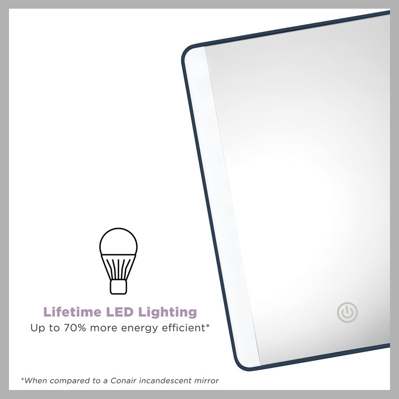 - Lighted Vanity Makeup Mirror: This battery-operated lighted makeup mirror uses an energy-saving lifetime LED bulb that is 70% more energy efficient compared to a Conair Incandescent mirror. It provides bright light and the bulbs won’t burn out, ever.