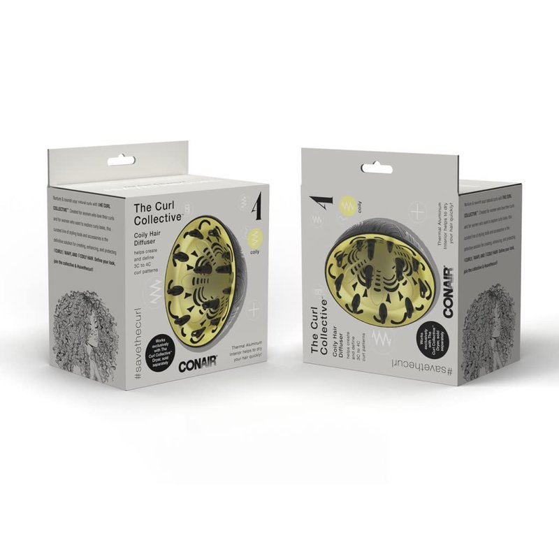 - Conair Curl Collective Exclusive: this Coily Diffuser is custom-designed for use with The Curl Collective 1875 Watt Ionic Ceramic Hair Dryer.
