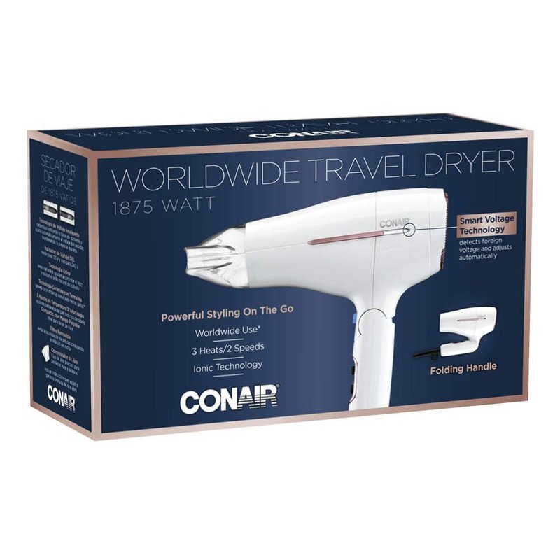 - Travel Hair Dryer: This compact travel dryer features smart voltage technology to detect foreign voltage and adjust automatically while maintaining all of your heat and speed settings, plus a folding handle for easy storage